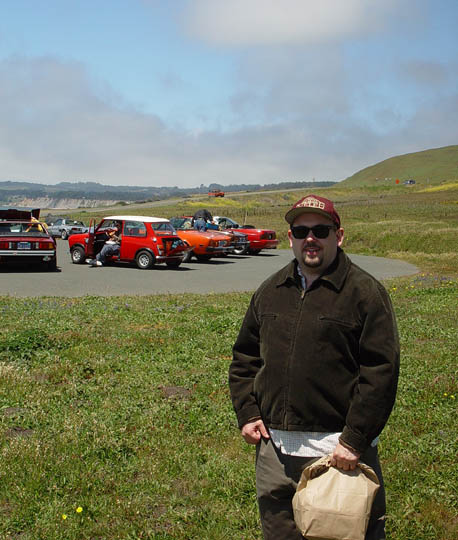 Still clutching his well-used barf bag, our intrepid navigator is glad to be out of the car.